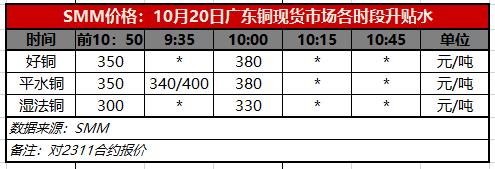 10月20日广东铜现货市场各时段升贴水(第二时段10:00)【SMM价格】