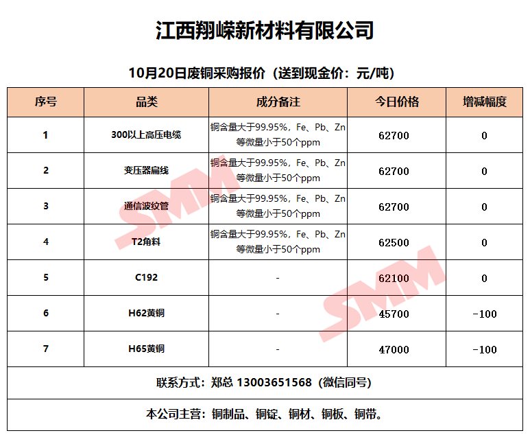 10月20日江西翔嵘新材料 废铜采购报价