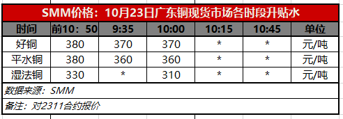 10月23日广东铜现货市场各时段升贴水(第二时段10:00)【SMM价格】