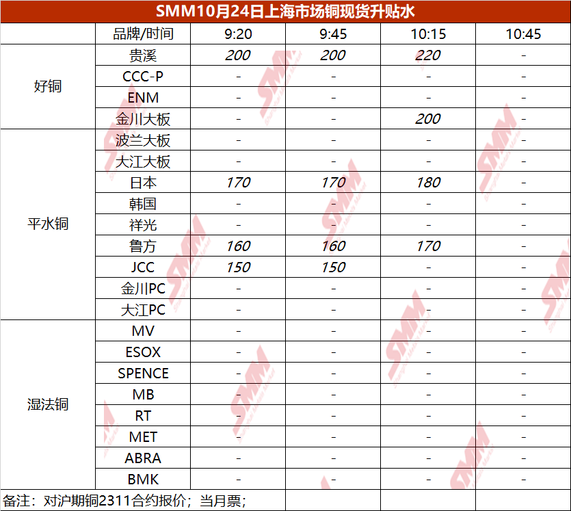 10月24日上海市场铜现货升贴水(第三时段)【SMM价格】