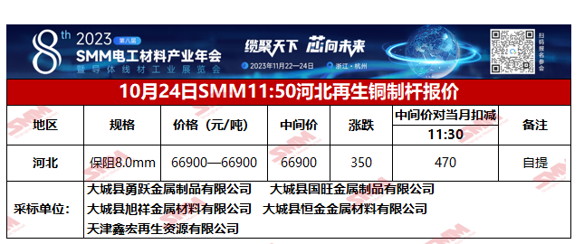 10月24日SMM河北地区再生铜制杆报价