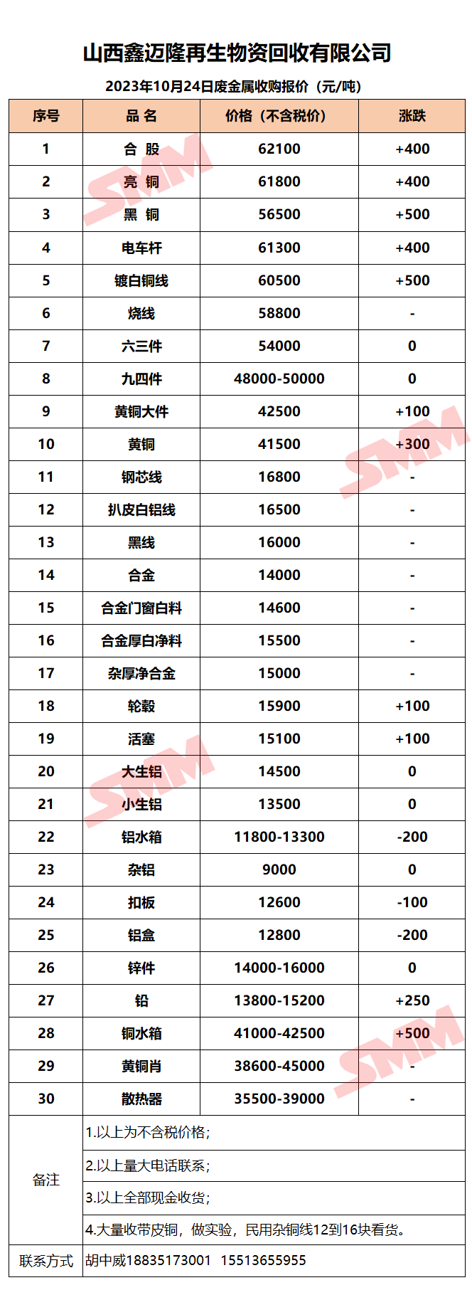 10月24日山西鑫迈隆 废金属收购报价