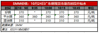 10月24日广东铜现货市场各时段升贴水(第四时段10:45)【SMM价格】
