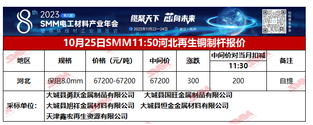 10月25日SMM河北地区再生铜制杆报价