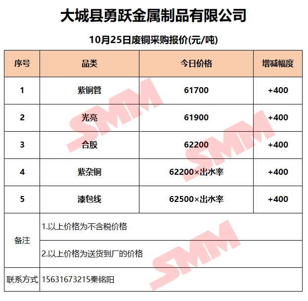 今日大城勇跃,废铜采购报价已更新,有货的朋友欢迎联系我们!