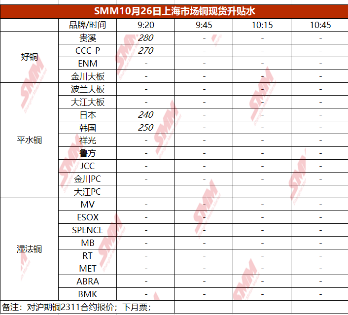 10月26日上海市场铜现货升贴水(第一时段)【SMM价格】