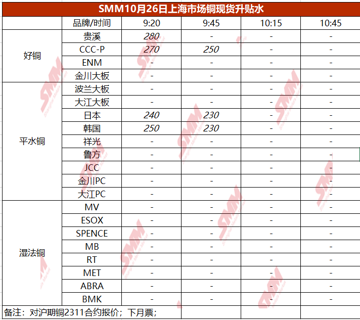 10月26日上海市场铜现货升贴水(第二时段)【SMM价格】