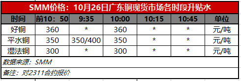 10月26日广东铜现货市场各时段升贴水(第二时段10:00)【SMM价格】