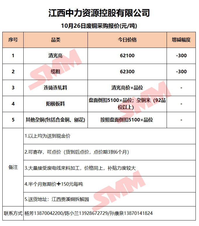 10月26日江西中力 废铜采购报价