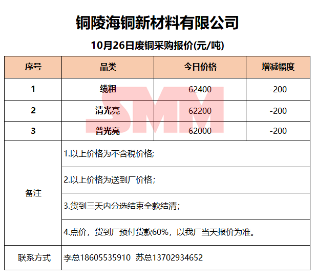 10月26日铜陵海铜 废铜采购报价