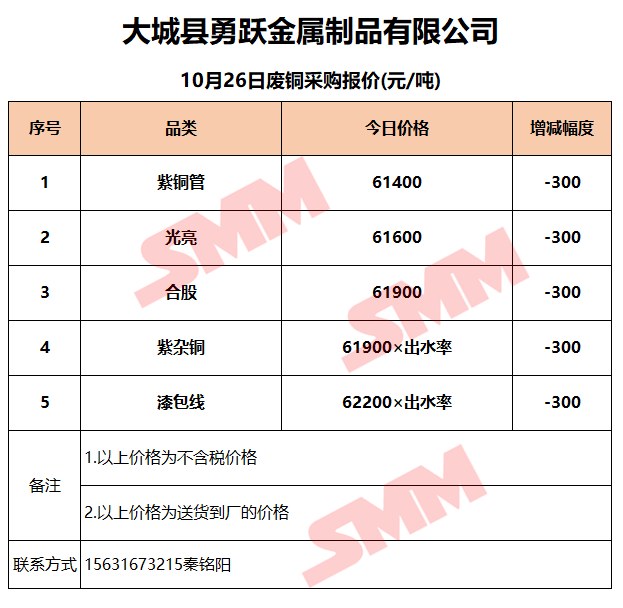 10月26日大城勇跃 废铜采购报价