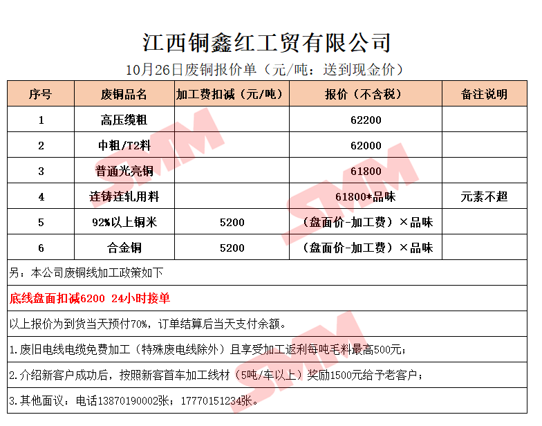 10月26日江西铜鑫红 废铜采购报价
