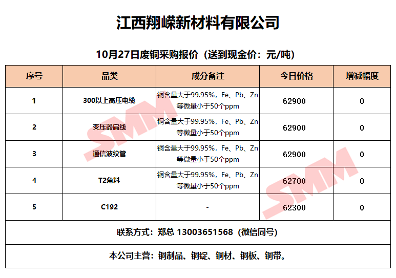 10月27日江西翔嵘新材料 废铜采购报价