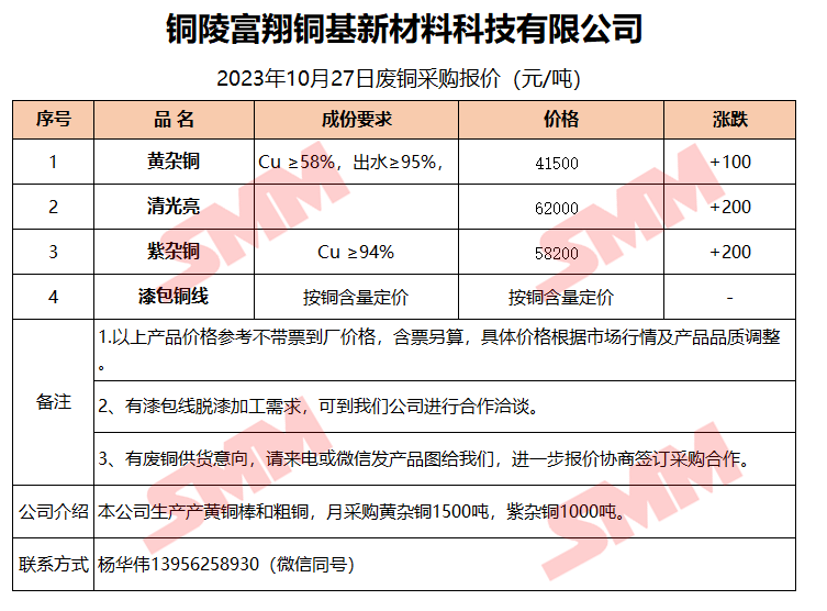 10月27日铜陵富翔 废铜采购报价