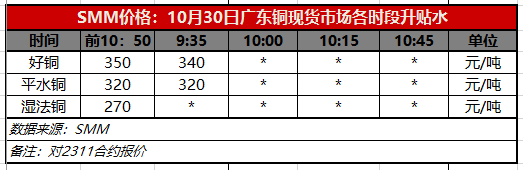 10月30日广东铜现货市场各时段升贴水(第一时段9:30)【SMM价格】