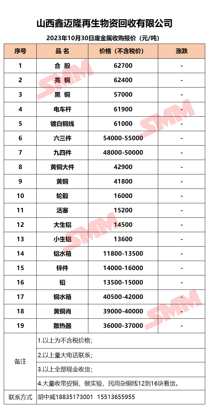 今日山西鑫迈隆,废金属收购报价已更新,有货的朋友欢迎联系我们!