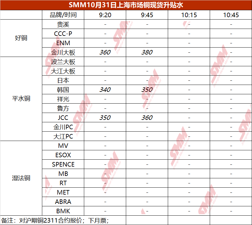 10月31日上海市场铜现货升贴水(第二时段)【SMM价格】
