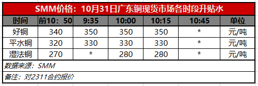 10月31日广东铜现货市场各时段升贴水(第三时段10:15)【SMM价格】