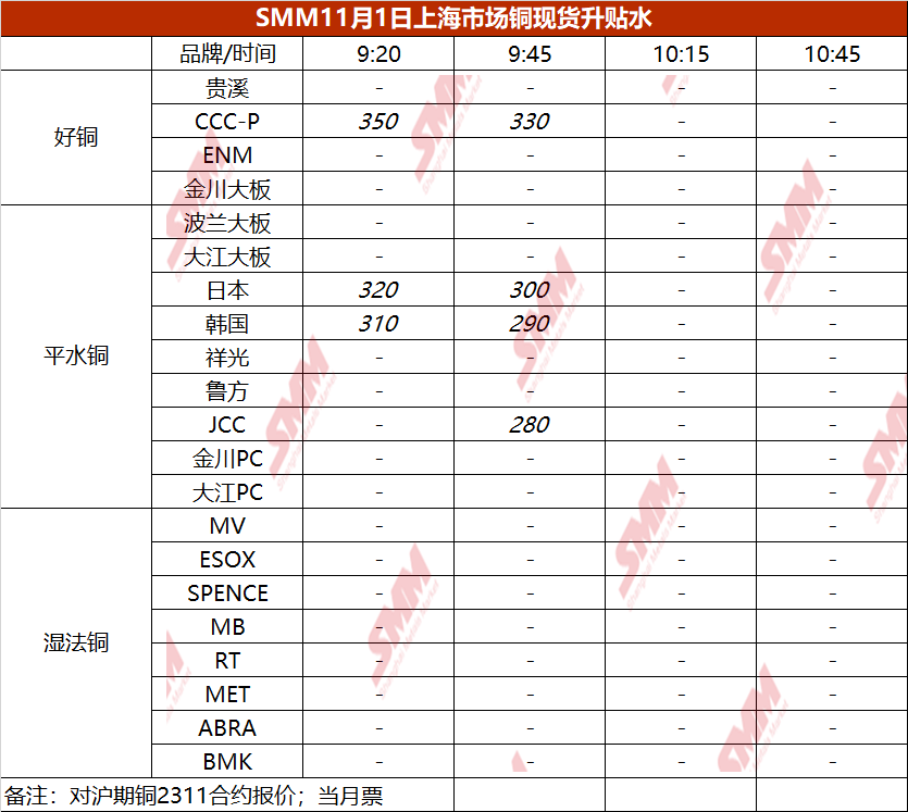 11月1日上海市场铜现货升贴水(第二时段)【SMM价格】