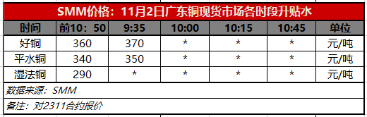 11月2日广东铜现货市场各时段升贴水(第一时段9:30)【SMM价格】