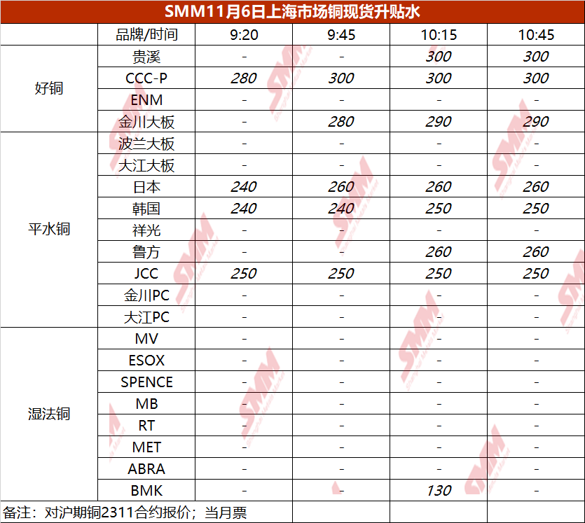 11月6日上海市场铜现货升贴水(第四时段)【SMM价格】