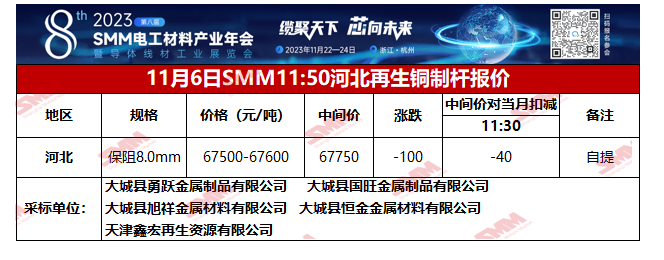 11月6日SMM河北地区再生铜制杆报价