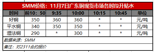 11月7日广东铜现货市场各时段升贴水(第二时段10:00)【SMM价格】