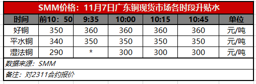 11月7日广东铜现货市场各时段升贴水(第四时段10:45)【SMM价格】
