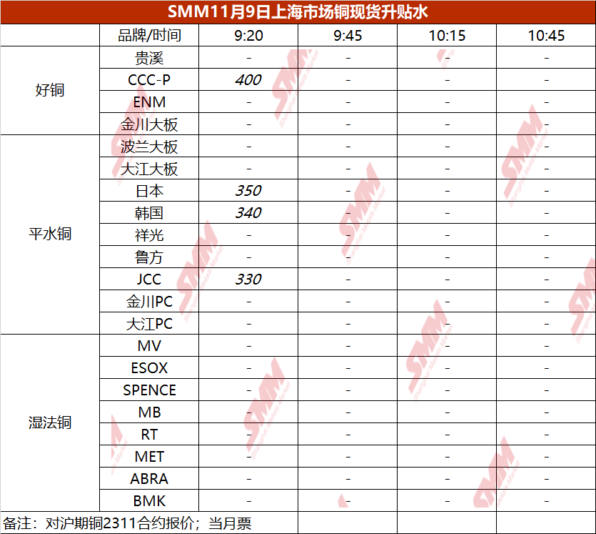 11月9日上海市场铜现货升贴水(第一时段)【SMM价格】