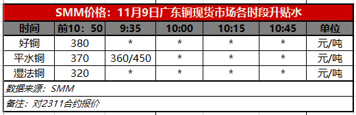 11月9日广东铜现货市场各时段升贴水(第一时段9:30)【SMM价格】