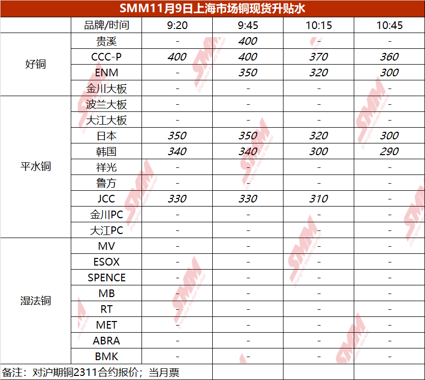 11月9日上海市场铜现货升贴水(第四时段)【SMM价格】