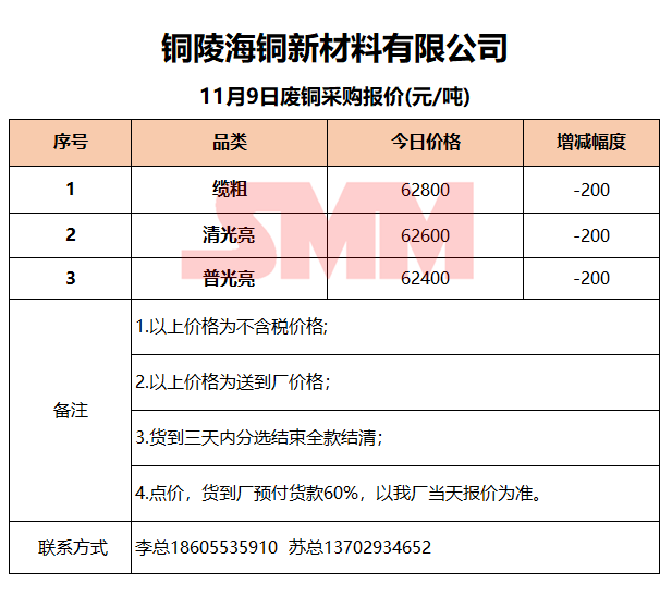 11月9日铜陵海铜 废铜采购报价