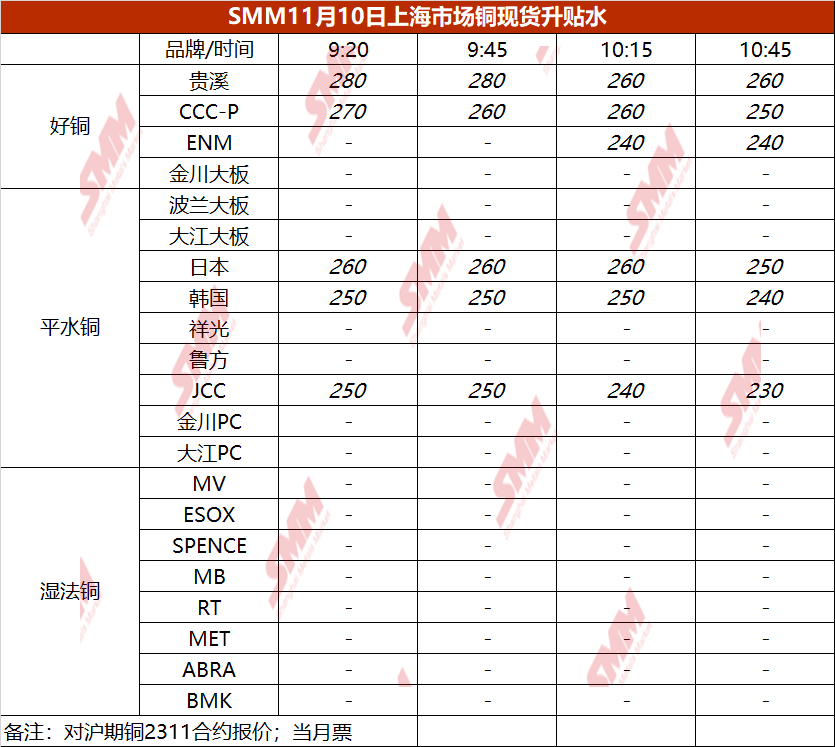 11月10日上海市场铜现货升贴水(第四时段)【SMM价格】
