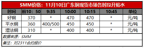 11月10日广东铜现货市场各时段升贴水(第三时段10:15)【SMM价格】