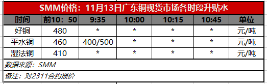 11月13日广东铜现货市场各时段升贴水(第一时段9:30)【SMM价格】