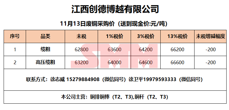 今日江西创德博越,废铜采购报价已更新,有货的朋友欢迎联系我们!