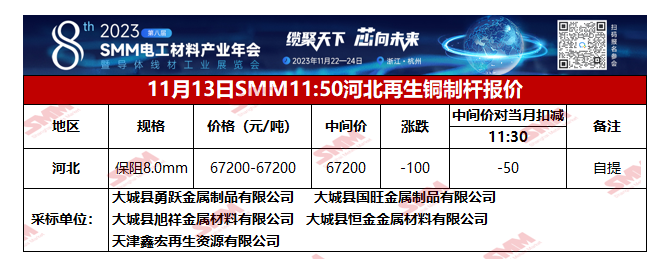 11月13日SMM河北地区再生铜制杆报价
