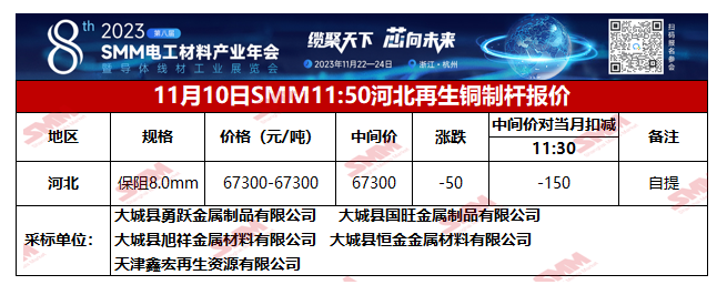 11月10日SMM河北地区再生铜制杆报价