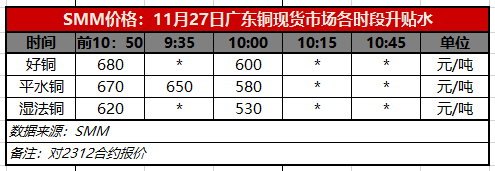 11月27日广东铜现货市场各时段升贴水(第二时段10:00)【SMM价格】