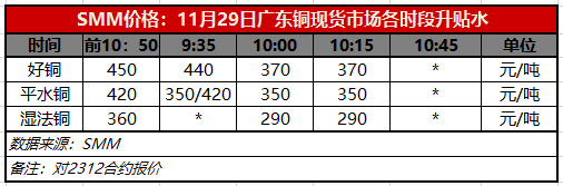 11月29日广东铜现货市场各时段升贴水(第三时段10:15)【SMM价格】