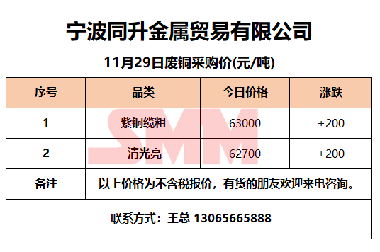 11月29日同升金属 废铜采购报价