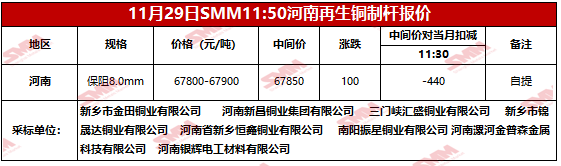 11月29日SMM河南地区再生铜制杆报价