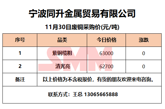 11月30日同升金属 废铜采购报价