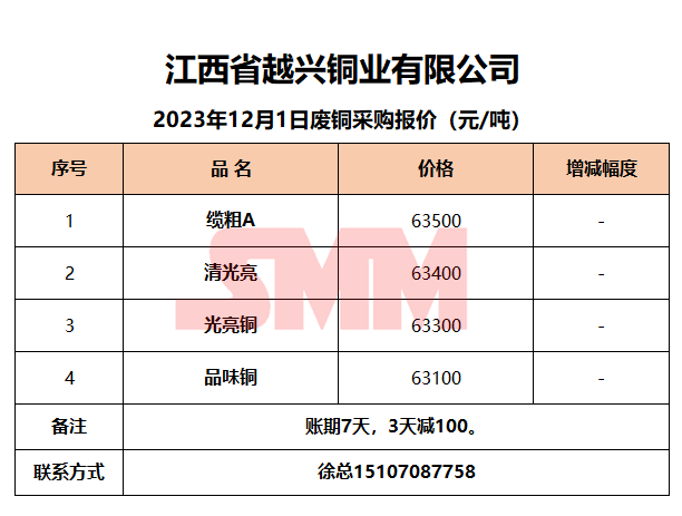 12月1日江西越兴 废铜采购报价