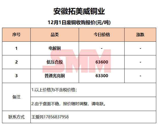 12月1日安徽拓美威 废铜收购报价