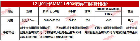 12月01日SMM河南地区再生铜制杆报价