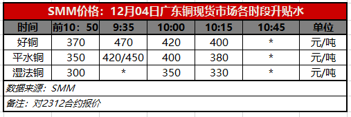 12月4日广东铜现货市场各时段升贴水(第三时段10:15)【SMM价格】