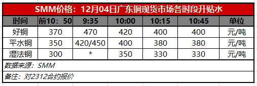12月4日广东铜现货市场各时段升贴水(第四时段10:45)【SMM价格】