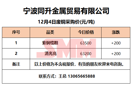 今日宁波同升金属,废铜采购报价已更新,有货的朋友欢迎联系我们!