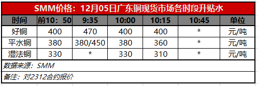 12月5日广东铜现货市场各时段升贴水(第三时段10:15)【SMM价格】